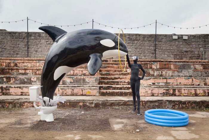 Dismaland was a temporary art project organized by street artist Banksy in the seaside resort of Weston-super-Mare in Somerset, England. The pop-up exhibition at the Tropicana, a disused lido, was “a sinister twist in Disneyland.” Banksy described it as a “family theme park unsuitable for children.” The show featured 58 artists of the 60 Banksy originally invited to participate. I think the killer whale jumping out of the toilet was my favorite artwork in Dismaland. I think its hysterical that he thought of this. I love everything about this unique piece of artwork. I love how real he made the whale and the trainer look. I love that he is mocking SeaWorld. I think it’s pretty cool that he was able make the whale stay in that position without falling or a pole holding the whale in place.